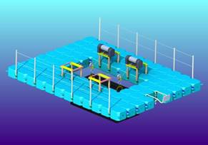 Рис. 8 - Типы якорей: а, b - шток-анкер; с - якорь Тротмана; d - якорь Холла; е - якорь Грузона; f - якорь Шпека; g - клипперский якорь со штоком и поворотными лапами (якорь Мартина); h - грибовидный «мертвый» якорь; i - дрек, кошка, верт; j - плавучий якорь; t - откидной шток; 2 - неподвижный шток; 3 - буй; 4 - шпрюйт; 5 - якорный трос; 6 – сорлинь Первые три типа относятся к группе так называемых штоковых якорей (шток-анкеров). Они применялись на судах в XIX в. В настоящее время их можно встретить, например, на спортивных и парусных учебных судах. На современных судах и боевых кораблях устанавливают якоря патентованной системы (рис. d-g). Они не имеют штока, и их лапы могут поворачиваться в обе стороны. Изображенный на рис. h якорь используют при длительной стоянке судна (например, на противопожарных судах и т. д.). По способу размещения якорей якорные устройства бывают с обычными якорными клюзами, с якорными нишами, с выступающими клюзами, без клюзов (хранение якорей на палубе). Кроме того, якорные устройства можно разделить на обычные и глубоководные. Основные методы и принципы якорения. 6. Методы фиксации платформ Существует несколько методов фиксации платформ относительно берега и береговых сооружений. Например, фиксация с помощью столбовых свай актуальна для водоемов с сезонной, искусственной или природной сменой уровня воды. Но для монтажа столбовых свай необходимо, как минимум, дополнительное оборудование и специальные механизмы для их забивания или «завинчивания» (винтовые сваи). На водных объектах с незначительной скоростью течения и несущественной волновой и ветровой нагрузкой привязка конструкции к берегу может осуществляться с помощью растяжек. Во всех остальных случаях применяются якоря, вес которых зависит от эксплуатационных условий и размеров платформы. Установка (укладка) ж/б якорей происходит при помощи плавкрана или специального понтона (такелажного плота - Рис. 9), который может быть собран из элементов МПП. На практике, как правило, используются комбинированные (смешанные) схемы якорения.
