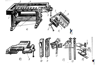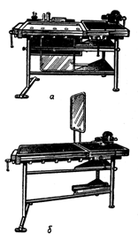 Рис.1 - Столярный верстак. а верстачную доску (крышку) — из древесины твердых лиственных пород: березы, дуба, бука, ясеня. Верстачная доска имеет толщину 60...70 мм и ширину 400...500 мм. По росту верстак подбирают следующим образом: столяр должен встать около верстака и опереться на него ладонями; если в выпрямленном состоянии столяр без затруднений опирается на верстак, то он подобран правильно. Верстак должен быть закреплен на рабочем месте, а инструменты располагаться так, чтобы ими было легко и удобно пользоваться. При эксплуатации верстака надо следить за его исправностью. Верстачная доска должна быть ровной, без перекосов, так как на перекошенной доске трудно выполнять точную работу. Тиски должны прочно зажимать обрабатываемый материал, а болты, скрепляющие верстак, должны быть хорошо затянуты. Клинья должны входить в гнезда плотно, но не слишком туго, чтобы не выколоть их края, причем гнезда должны иметь одинаковый размер, чтобы клин можно было вставить в любое гнездо. Винты делают обычно металлическими, реже деревянными для плавного движения винты и ходовые части верстака периодически смазывают. В нерабочем состоянии винты рекомендуется держать в слегка затянутом состоянии для повышения долговечности верстак после изготовления покрывают олифой. Не следует устанавливать его вблизи отопительных приборов и ставить на него горячие предметы, о также подвергать увлажнению. При выполнении работ, которые могут повредить верстак (пиление, долбление, сверление резание стамеской), необходимо под обрабатываемые элементы положить доску.