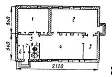 Рис.1 - План школьных мастерских: 1 кабинет обслуживающего труда; 2 — столярное отделение; 3 –инструментальная 4 — слесарно-механическое отделение; 5— вестибюль; 6 — раздевалка; 7— тамбур; 8—туалет. Комбинированные мастерские занимают одно помещение размером до 90 м² и предназначены для выполнения всех видов работ учащимися (обработка древесины, металлов вручную и на станках, электромонтажные работы). Универсальные мастерские по сравнению со специализированными позволяют более рационально и, следовательно, экономически эффективно использовать учебные площади. Однако с точки зрения методики трудового обучения они менее удобны.