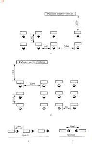Рис.3 Варианты расстановки оборудования: а – фронтальная, б – линейная. Поперечное расположение верстаков к проходу: в – в затылок, г – попарно по фронту. Клаузуры Графический поиск вариантов решения проектной проблемы.
