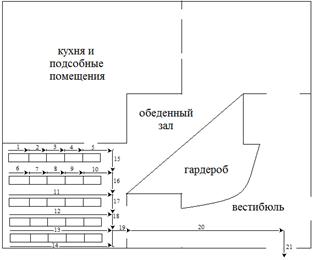 3. Расчет путей эвакуации Задание: Рассчитать фактическое время эвакуации людей с первого этажа из обеденного зала на улицу. Количество посетителей – 200 человек. Принимаем для обеденного зала деревянные столы для приема пищи на четырех человек с размерами 1х1,5 м в плане. Определяем