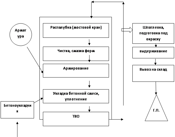 2.4. Сырьевые материалы Сырьевые материалы для приготовления бетонной смеси 1) Портландцемент марки 400, удовлетворяющий требованиям ГОСТа 10178-85, нормальная густота цементного теста 27%; 2) Щебень известковый, удовлетворяющий требованиям ГОСТа 8267-93, фракция 5-20, марка прочности по дробимости – 800, водопоглощение – 0.8%, морозостойкость 150 циклов, содержание слабых зерен – 5%, содержание лещадных зерен – 23%, содержание пылевидных, илистых и глинистых частиц – 2%; 3) Песок, удовлетворяющий требованиям ГОСТ 8736-93, модуль крупности Мк = 1,1; содержание примесей в песке не должно превышать 3%, водопотребность песка 7%; 4) Вода, принимаемая для приготовления б/смеси не должна содержать вредных примесей, препятствующих нормальному схватыванию и твердению цемента. Воду используют техническую, удовлетворяющую требованиям ГОСТ 23732-79. Общее содержание солей не более 5000 мг/л, содержание сульфатов в пересчете на SO4 не более 2700 мг/л. Водородный показатель рН ˃ 4. 3. Технологическая часть 3.1. ТЭО технологии и способа производства В производстве ЖБК могут применяться различные организационные способы производства: агрегатно-поточный, конвейерный, полуконвейерный, стендовый, кассетный. При выборе способа производства как правило проводят технико экономическое обоснование (ТЭО) по приведенным затратам на создание линии. Агрегатно-поточный способ производства – при небольших капитальных затратах он допускает выполнение широкой номенклатуры изделий. Технологические операции последовательно выполняют на нескольких рабочих постах. Для соблюдения последовательности форму передают от одного поста к другому с помощью мостового крана. Этот способ соответствует больше всего условиям мелкосерийного производства на заводах средней и небольшой мощности. Конвейерный способ производства – технологический процесс расчленяется на элементные процессы, которые выполняются одновременно на отдельных рабочих постах. Формы с изделиями перемещаются от одного поста к другому специальными транспортными устройствами, каждое рабочее место обслуживается закрепленным за ним звеном. Характерен принудительный ритм работы, т.е. одновременное перемещение всех форм по замкнутому технологическому кольцу с заданной скоростью. Стендовый способ производства – изделия формуют в стационарных формах, и они твердеют на месте формования, в то время как технологическое оборудование и обслуживающие его рабочие звенья перемещаются от одной формы на стенде к другой. Стендовая технология целесообразна при изготовлении крупноразмерных предварительно напряженных конструкций длиной более 9 метров для промышленных и гражданских зданий. Кассетный способ производства – формование изделий производится в вертикальном положении в стационарных разъемных металлических групповых формах-кассетах, где изделия остаются до приобретения бетоном необходимой прочности. Звено рабочих в процессе производства перемещается от одной кассетной формы к другой, организуя производственный поток. 3.2. Технологические режимы обработки Производство колонн осуществляется стендовым способом в унифицированном типовом пролете УТП-1 по следующей функциональной схеме №1. Технологические операции при данном способе производства осуществляются на одном посту. При производстве колонн технологический 