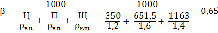 Определяем по таблице ориентировочный расход воды на 1 м3 бетонной смеси. Расход воды составляет В = 200 л. Расход цемента составит Ц = 200 * 1,75 = 350 кг. 1. Сумма абсолютных объемов составляющих бетонной смеси равна 1 м3 или 1000 литров.