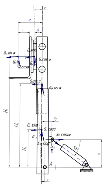 Рисунок 3. Схема действия сил в механизме наклона грузоподъемника