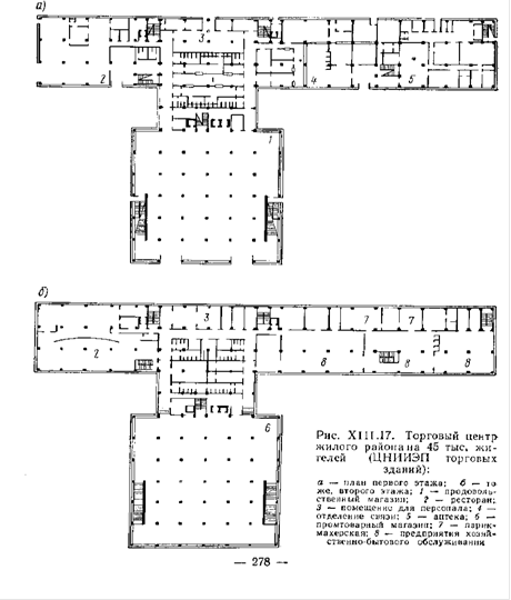 а) - план первого этажа б) - план второго этажа 5 - аптека 6 - промтоварный магазин 7 - парикмахерская 8 - предприятия хозяйственно-бытового обслуживания 1 - продовольственный магазин 2 - ресторан 3 - помещение для персонала 4 - отделение связи Объемно-планировочные решения торговых центров могут быть самые разнообразные: в группе отдельно стоящих зданий, расположенных в один ряд; в два ряда, образуя внутреннюю улицу; по периметру торговой площади; в одном здании и т.д. Однозальный крытый рынок