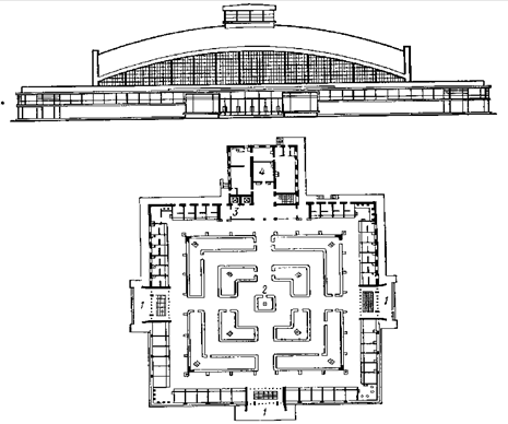 1 - входной узел 2 - торговый зал 3 - лифты 4 - административно-обслуживающие помещения При планировке торговых центров необходимо решить такие основные вопросы, как доступ к месту торговли, подъезды и стоянки легкового транспорта, подъезды грузового транспорта, доставляющего товары в магазины, место разгрузки товаров, место для хранения товаров и использованной тары. Надо проектировать здания так, чтобы доставка товаров, ее разгрузка, распаковка были изолированы от потока покупателей. Кооперированные торговые центры компонуют по ячейковой структуре с сеткой колонн преимущественно 6 X 6 или 6 X 12 м. При проектировании целесообразно предусматривать индивидуальные входы в помещения различного назначения - в отделение связи, аптеку или в помещении бытового обслуживания. Высота торговых залов должна быть 3,3 м при площади до 300 м2, в залах большей площади высоту устанавливают 4,2 м, в подвальных помещениях - 2,7 м, а до выступающих конструкций - не менее 2,4 м. Состав и площади помещений назначают в соответствии с СИиП II-Л.7-70. Крытые рынкиОдним из комплексов торговых зданий районных и городских центров являются крытые рынки. Такие торговые предприятия, как крытые рынки, бывают двух типов: рынки для продажи сельскохозяйственных продуктов и комплексные рынки, где есть возможность и продать сельскохозяйственные продукты, и купить необходимые промтовары. В первом типе рынков места продажи сельскохозяйственных продуктов расположены в центре зала и по периметру здания. В крытых рынках предусматривают торговые места постоянные, занимаемые государственными торговыми предприятиями, и разовые, предназначаемые для продажи товаров колхозами и отдельными лицами. Торговые места распределяют по зонам: продажа картофеля, овощей, фруктов, ягод, мяса, дичи, рыбы и т.д. Проходы проектируют различной ширины: основные 4-10 м, боковые 2,5-7 м, поперечные 1,5-5 м. Общую площадь торгового зала рынка устанавливают из расчета 0,5 м2 на одного покупателя, а площадь на одно торговое место принимают от 6 до 13 м2. Температура внутри помещений рынка должна быть зимой не менее +5°С, летом не более 4-18-20° С Композиционное решение рынков - центрическое-компактное, блочное и павильонное. Центрическая композиция более удачна, она требует значительно меньшей площади участка, сметная стоимость зданий меньше на 10-14% и она более экономична и по текущим затратам. Проектирование залов пространственной безопорной структуры с крупнопролетными покрытиями повышает на 7-10% экономичное использование площадей. В рынке проектируют служебно-вспомогательные помещения: санитарного обслуживания, административные помещения. Кроме того, должны быть буфеты и туалеты. В помещениях санитарного обслуживания проверяют продукты, поступающие в продажу. В административно-обслуживающих помещениях продавцы обеспечиваются оборудованием для торговли. В большинстве рынков имеются подвальные помещения, часто обеспеченные холодильниками для хранения не проданных скоропортящихся товаров. В рынках второго типа наряду с продажей сельскохозяйственных продуктов продают промышленные товары. На рисунке (см. рис. ниже) в центрально островных рядах торгуют продуктами сельского хозяйства, а в задней части и по окружности располагают магазины промтоваров. К рынкам должны быть хорошие подходы, не пересекаемые т