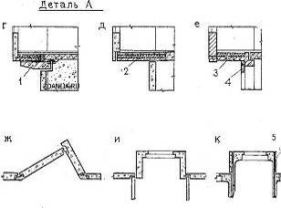 Рис.1. Эркеры a - формы планов эркеров; б - эркер с несущими стенами; в - навесной зркер; г - навесной эркер в панельном доме, опертый на консоли внутренних стен; д - то же, на утепленную консоль перекрытия; е - то же, в кирпичном доме: эркер оперт на консольную, керамзитобетонную плиту; ж - стены эркера из панелей; и - то же, из объемного элемента; к - устройство эркера в объемно-блочном доме; 1 - железобетонная консоль панели внутренней стены; 2 - консоль перекрытия; 3 - консольная керамзитобетонная плита эркера; 4 - оконная перемычка; 5 - утепляющая панель. Если объемно-планировочное решение здания предусматривает устройство эркера на всю высоту здания, эркер проектируют несущим, опирающимся на собственный фундамент. В домах с неповторяющимися поэтажными планами эркеры могут иметь различную протяженность по высоте здания, начинаться со второго или третьего этажа и т.п., представляя собой навесную конструкцию. В домах с массивными наружными стенами такие эркеры могут опираться на консольные плиты или балки, защемленные в наружных стенах. В зданиях с ненесущими наружными стенами конструкции эркера проектируют облегченными и опирают на различного типа консоли из внутренних несущих конструкций: консоли колонн каркаса, перекрытий, балки, защемленные во внутренних стенах. В панельном домостроении используют для стен эркеров панели горизонтальной и однорядной разрезки либо объемные элементы, опертые на собственный фундамент или консоли перекрытий. В навесных эркерах нижнее перекрытие представляет собой наружное ограждение, нуждающееся в эффективном утеплении. Поскольку полкомнаты в эркере и за его пределами должен находиться на одной отметке, утеплитель, находящийся под полом или в толще перекрытия, должен обладать минимальной толщиной при максимальной эффективности. Иногда утепление располагают под плитой перекрытия эркера в виде утепляющей панели или подвески слоев утепляющего материала и облицовочных плит. Покрытие эркера проектируют утепленным в виде совмещенной или чердачной крыши. Подвесные потолкиС помощью подвесной конструкции можно не только скрыть дефекты старого потолка и сделать его более привлекательным внешне, но и выполнить его звукоизоляцию и даже улучшить освещение. С помощью подвесного потолка можно улучшить и теплоизоляцию в помещении. По этой причине устройство подвесного потолка может оказаться актуальным для коттеджа с деревянными перекрытиями. Подвесной потолок позволяет перенести инженерные коммуникации - например, вентиляционное и тепловое оборудование, компьютерные разводки, электропроводку и слаботочные сети - в надпотолочное пространство. Спрятанное за подвесным потолком инженерное оборудование, расположенное под перекрытием, при необходимости ремонта будет легко доступно - в зависимости от конструкции потолка как локально, так и по всей его площади. Подвесной потолок позволяет разместить в пространстве за ним специальные приборы "быстрого реагирования", например, головки систем пожаротушения. Для встраиваемого в подвесные потолки оборудования желательно предусматривать дополнительную опору. В любом случае необходимо, чтобы нагрузка приходилась на плиту, а на подвесную систему. Исключение составляют лишь легкие светильники, весом не более 3 кг. Однако и их можно опирать только на несу
