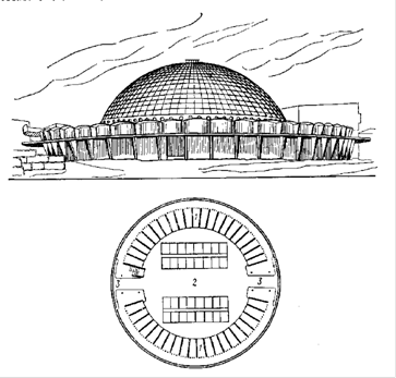 Однозальный крытый рынок: 1 – магазины, 2 – торговые места, 3 – входы. Эркер - вынесенная за плоскость фасадной стены часть помещений (преимущественно жилых комнат). Эркеры проектируют прямоугольной, треугольной, трапециевидной, полукруглой формы в плане. Назначение эркера - увеличение площади помещения и обогащение его интерьера, улучшение условий освещения и инсоляции помещений, обращенных на неблагоприятную сторону горизонта. Эркер имеет в своих вертикальных гранях окна или сплошное остекление. Подобно лоджиям и балконам эркеры обогащают форму здания и служат композиционным средством масштабных и метроритмических членений фасадов. Иногда эркеры применяют в сочетании с лоджиями и балконами. Конструкции эркера (рис.1) проектируют в соответствии с объемно-планировочным и конструктивным решением здания.