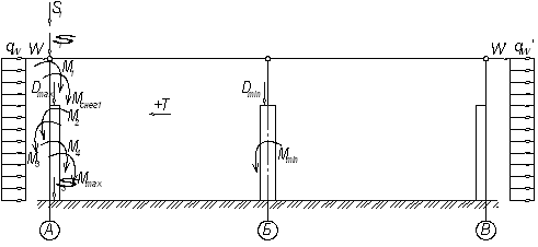 0,48 · 0,71 · 0,9· 0,8 · 6 = 1,52 кН/м (W3’ = 1,5 · W = W’ = - Изгибающий момент в заделке от распределённой ветровой нагрузки на крайней колонне по оси А: M = 0,86 · 12 · ( - Эквивалентная равномерно-распределённая нагрузка будет равна: M = - На правой колонне (по