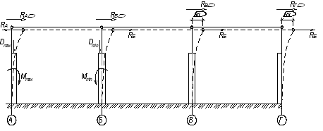 б) Продольные силы: N1-1 = N2-2 = N3-3 = N4-4 = S1 = 70 кН в) Поперечная сила: Q4-4 = R = -0,6 кН Определение усилий в стойке от давления кранов. Рама смещается под действием внешних сил. Если бы смещения не происходило, то возникли бы следующие реакции: