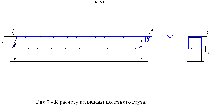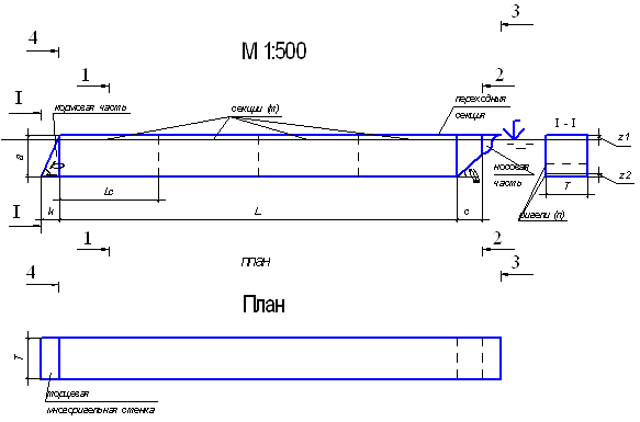 Расчет величины полезного груза, размещаемого в плавучем доке при частичном заполнении камеры водой: Грузоподъемность – максимальная масса груза, который поднимает док. Вес поднимаемого полезного груза определяется по формуле: Р где Р G = mg где Р дока, Н G – собственный вес дока, кг V Объем погруженной в воду части дока определяется по формуле: V S = S где S S S S S z = a-z z = 5,8-0,6-0,4 = 4,8 м S S S S S S S S = 6,20+264+14,3+3,21 = 287,71 м² V G = 900000·9,81 = 8829 кН Р Р MГР = Pтр / g MГР = 7541,14 / 9,81 = 768,72 кг. M 1:500