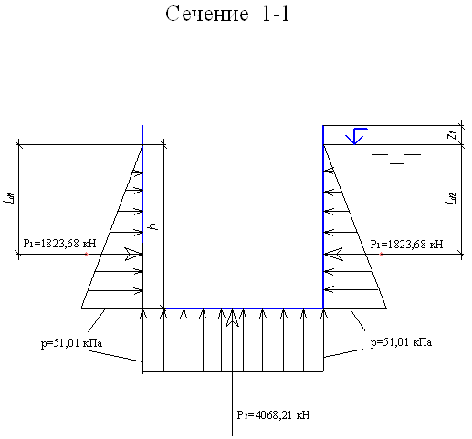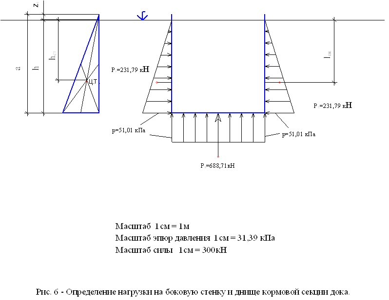 Масштаб схемы 1см = 1м Масштаб эпюр давления 1см = 25,506 кПа Масштаб силы 1см = 1000 кН Рис.1 – Расчетная схема к определению нагрузки на элемент рабочей секции дока. Расчет гидростатических нагрузок на переходную секцию дока Две боковые стенки переходной секции представляют собой трапеции. Для определения сил, действующих на стенки, разобьем их на прямоугольник и треугольник. Эпюру давления на боковые стенки и наклонное днище переходной секции строим по формуле: p = ρgh, Па h h = a - z p гидростатическая нагрузка плавучий док где h p p p p Сила давления на прямоугольный боковой элемент находится по формуле: P где W прямоугольный боковой элемент. W где S b – ширина переходной секции, м P P Центр приложения силы Р3: