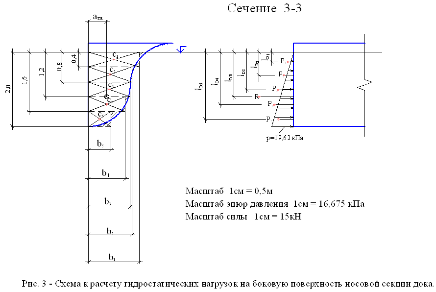 Масштаб схемы 1см = 1м Масштаб эпюр давления 1см = 25,506 кПа Масштаб силы 1см = 150 кН Рис. 2 - Схема к расчету нагрузки на переходную секцию дока. Расчет гидростатических нагрузок на носовую секцию дока Боковая поверхность носовой секции представляет собой фигуру произвольной формы. Боковой элемент носовой части разбивается по вертикали на ряд составляющих. Кривая аппроксимируется и заменяется прямыми. Определяем нагрузку от давления воды на каждый составляющий элемент по формуле: Pi = ρgbi·sinα·(l ldi = 2(l где l l bi – ширина рассматриваемого участка, м Расчеты ведутся в таблице: