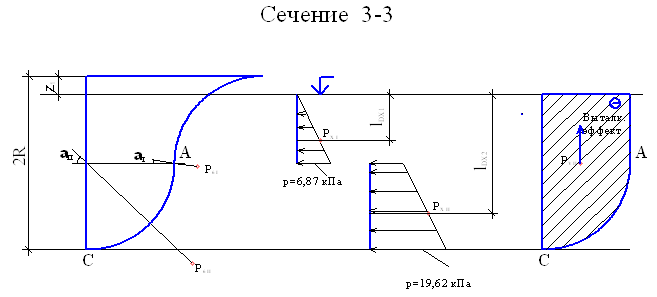равнодействующей R (координаты а В-В выбирают по вертикали. R = P1 + P2 + P3 + P4 + P5 ; R = 1,8 + 4,59 + 7,26 + 9,12 + 7,06 = 29,83 кН Координаты равнодействующей: а а 29,83 = 0,82 м l l Криволинейную лобовую поверхность заменяем вертикальной стенкой. Гидростатическое давление на эту стенку будет определяться по формуле: р = ρg(2R- z p = 1000 · 9,81 · (2,6 – 0,6) = 19,62 кПа