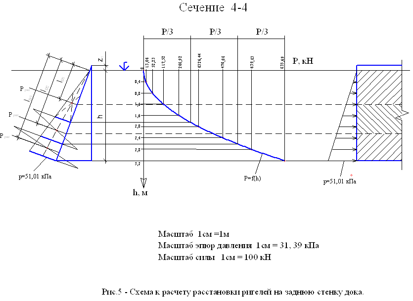 Масштаб 1см = 0,5м Масштаб эпюр давления 1см = 10 кПа Масштаб силы 1см = 200 кН Рис.4 - Расчетная схема к определению нагрузки на лобовую поверхность. Расчет гидростатических нагрузок на кормовую секцию дока Расчет расстановки ригелей на заднюю стенку дока. Торцевая стенка дока шириной Т = 6,4 м перекрыта ригелями. Необходимо распределить 4 ригеля из условия равнозагруженности. Высота воды перед стенкой h = a-z1 ; h = 5,8 – 0,6 = 5,2 м а угол наклона равен tgβ = a / k ; tgβ = 5,8 / 2,5 = 2,32 = 67° Ригели рассчитываются графическим способ: 1) Определяем гидростатическое давление р = ρgh = ρg(a-z1) ; p = 1000 · 9,81 · (5,8 – 0,6) = 51 кПа Строим эпюру давления на стенку. 2) Построим кривую зависимости давления от высоты р = f(h). Для этого определяем силу суммарного давления при разной глубине. Р = WЭП = SЭП · T = ρg · h · T · h / 2sinβ , Н Результаты заносим в таблицу: