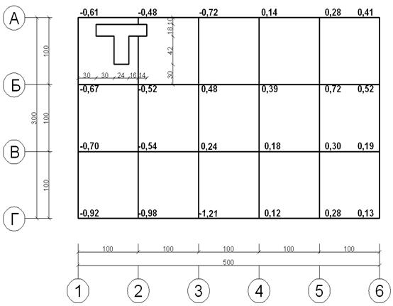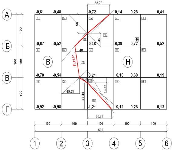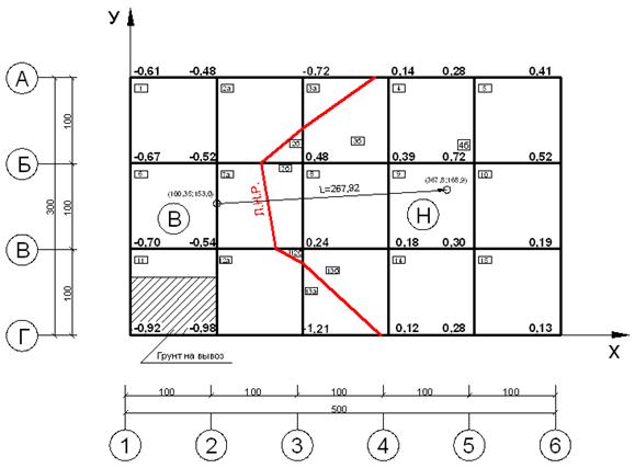 Рис. 1.1.1. Строительная площадка возведение подземный здание строительный конструкция 2. Вертикальная планировка строительной площадки Вертикальная планировка строительной площадки производится для выравнивания территории по заданным проектной отметке и уклону после производства подготовительных работ (расчистки территории, срезки растительного слоя). Трудоемкость выполнения основных планировочных процессов зависит от объемов земляных масс, а также от средней дальности перемещения грунта. Для определения объемов земляных масс нужно определить положение нулевой линии. 2.1 Определение линии нулевых работ Линия нулевых работ является границей между зонами выемки и насыпи. Рабочие отметки на этой линии равны нулю. (В точках линии не требуется никаких земляных работ). Линия нулевых работ проходит между теми смежными вершинами квадратов, рабочие отметки которых имеют противоположные знаки. Знак «+» рабочей отметки указывает на необходимость подсыпки грунта (планировочная насыпь), а знак «–» – на необходимость снятия лишнего грунта (планировочная выемка). Определение линии нулевых работ производится графически. Перпендикулярно к той стороне квадрата строительной площадки, где смежные вершины имеют рабочие отметки противоположных знаков, откладываются значения этих отметок (из данных вершин с учетом знака). Затем концы полученных отрезков, не принадлежащие стороне квадрата, в свою очередь соединяются отрезком. На пересечении последнего отрезка с данной стороной квадрата расположена точка линии нулевых работ. Расстояние от этой точки до вершин, имеющих соответственно рабочие отметки ha и hb, находятся как соотношение сторон подобных треугольников: