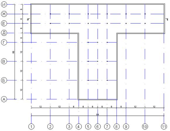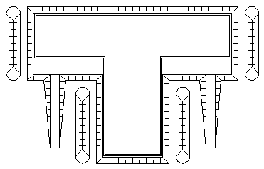 Рис. 4.6.1.1. Устройство опалубки. Участки бетонирования Определим объем опалубочных работ как площадь поверхности опалубки, соприкасающейся с бетоном (согласно ЕНиР Е4-1-34): ∑ Sопал. пов.=((6+0,5+6)∙44+(6,5+0,5+6,5)∙4)∙3,3=1993,2 (м2). 4.6.2 Армирование наружных стен здания Армирование стен осуществляется сетками. Объемом арматурных работ (согласно ЕНиР Е4-1-44; установка сеток и каркасов вручную) является общее число арматурных сеток (известной массы,кг),устраиваемое в конструкции. Найдем общую массу арматуры, устанавливаемой в наружных стенах здания: масса арматуры равна произведению всего объема конструкции Vнар.стен, м3, и степени армирования сеткой, принимаемой по заданию 15 кг/м3. Марм.сет.= Vнар.стен∙15=(84+18,5∙2+30,5∙2+42∙2+24)∙0,5∙3,3∙15=7177,5 (кг). Принимая, что размеры сеток не должны превышать 3*7м, получаем количество сеток n=48∙2∙2=192 (1,65*6м), устраиваемых между разделительными щитами опалубки стен. Найдем среднюю массу