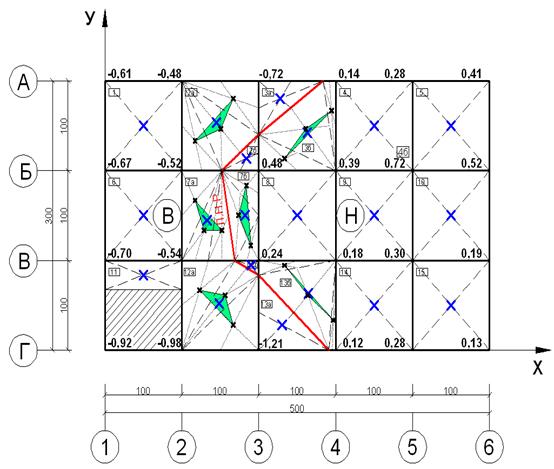 Рис. 2.1.1. Определение точки нулевых работ Рассмотрев все стороны квадратов, где смежные вершины имеют рабочие отметки противоположных знаков, получим серию точек, при последовательном соединении которых отобразится линия нулевых работ, отделяющая зону планировочной насыпи от зоны планировочной выемки (рис. 2.1.2.). 2.2 Расчет объемов работ по вертикальной планировке площадки В расчете используем метод четырехгранных призм, при котором объем насыпей и выемок, заключенный в отдельные квадраты или их части, отсекаемые линией нулевых работ, определяются по формуле: