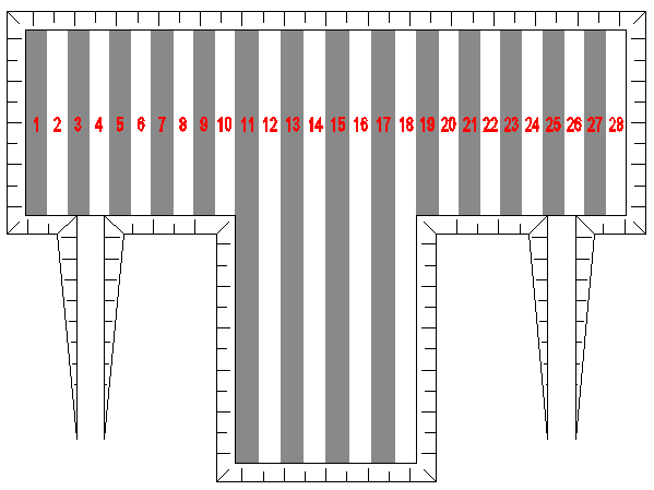 бетонируемых полос шириной 3м: Принимаем число полос Найдем общую площадь опалубливаемой поверхности (согласно ЕНиР Е4-1, единицей измерения опалубочных работ является площадь поверхности опалубки, соприкасающейся с бетоном): Для нечетных полос: Sопал. пов.=Рполосы∙hбет. подг.; где Рполосы – периметр одной бетонируемой полосы, hбет. подг.=0,2м – толщина слоя бетонной подготовки. Для полос 1,3,5,7,9,19,21,23,25,27 Sопал. пов.=59∙0,2=11,8 (м2); для полос 11,13,15,17 Sопал. пов.=130,5∙0,2=26,1 (м2). Для четных полос (кроме 18,28): Sопал. пов.=2∙bп∙ hбет. подг.; где bп – ширина одной бетонируемой полосы. Для полос 2,4,6,8,10,20,22,24,26 Sопал. пов.=2∙3∙0,2=1,2 (м2); для полос 12,14,16 Sопал. пов.=2∙3,25∙0,2=1,3 (м2); для полосы 18 Sопал. пов.= 2∙3,25∙0,2+ 35,5∙0,2=8,4 (м2); для полосы 28 Sопал. пов.= 2∙3∙0,2+26,5∙0,2=6,5 (м2). Подсчитываем объем опалубочных работ: ∑ Sопал. пов.=11,8∙10+26,1∙4+1,2∙9+1,3∙3+8,4∙1+6,5∙1= 252 (м2).