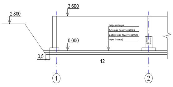 3. Отрывка котлована под здание 3.1 Планировочное и конструктивное решение подземной части здания Возводится подземная часть одноэтажного промышленного многопролетного здания. Конструктивная система – железобетонный каркас. Применяются комбинированные шаг и пролет колонн ( 6-метровый и 12-метровый ). Толщина наружной стены – 500мм; толщина внутренней стены – 350мм; сечение колонн – 400*400мм; высота цоколя – 0,8м. Под колонны промышленного здания предусматривается столбчатый монолитный железобетонный фундамент. Наружные стены здания устанавливаются на монолитном ленточном фундаменте (рис. 3.1.3. и 3.1.4.). Процесс возведения фундаментов из монолитного железобетона включает разбивку осей фундаментов, устройство опалубки, сборку и установку арматуры и бетонирование. Перед укладкой бетонной смеси необходимо тщательно подготовить грунтовое основание. Рыхлые и органические грунты должны быть удалены, места перекопки грунта следует заполнить уплотненным песком или щебнем. Для достижения монолитности железобетонных фундаментов бетонирование необходимо вести непрерывно, не допуская образования швов. Бетонную смесь укладывают слоями толщиной 20…50см, каждый последующий слой укладывают после уплотнения предыдущего и, как правило, до начала его схватывания.