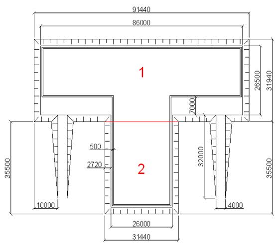 Рис. 3.2.1. Размеры котлована в плане Определение объема котлована: Разобьем котлован на 2 части прямоугольной формы. Последовательно найдем объем каждой части котлована по формуле для усеченной пирамиды: