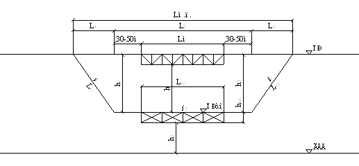 Визначення рівня проїзду тимчасового мосту з умов забезпечення підмостового габариту: ▼ПРт.м. =▼ ГВВ + h2 + hб=34,5+4.0+3.27=51,77 м ▼ГВВ – відмітка горизонту високої води 45м hб – будівельна висота судоплавної прогонової споруди, 3,27 h2 – висота підмостового габариту, 4,00 З двох значень відмітки підошви рейки приймається більше значення. ▼ПРт.м.=52,6 м Визначення конструкції надбудов та фундаментів: Розрахункова схема
