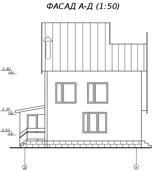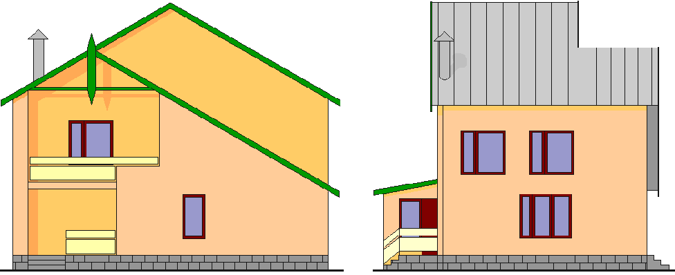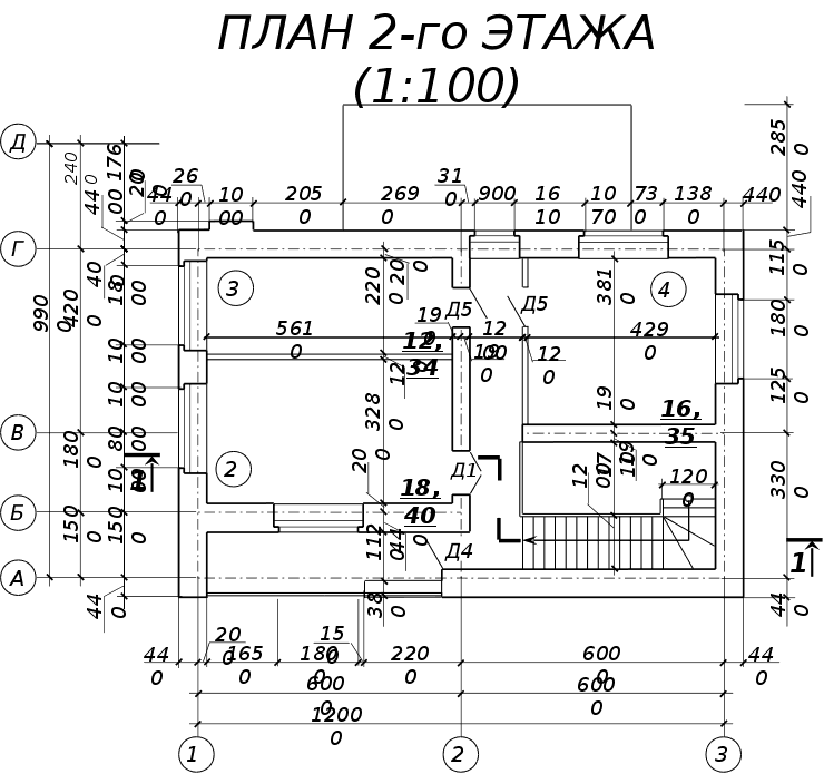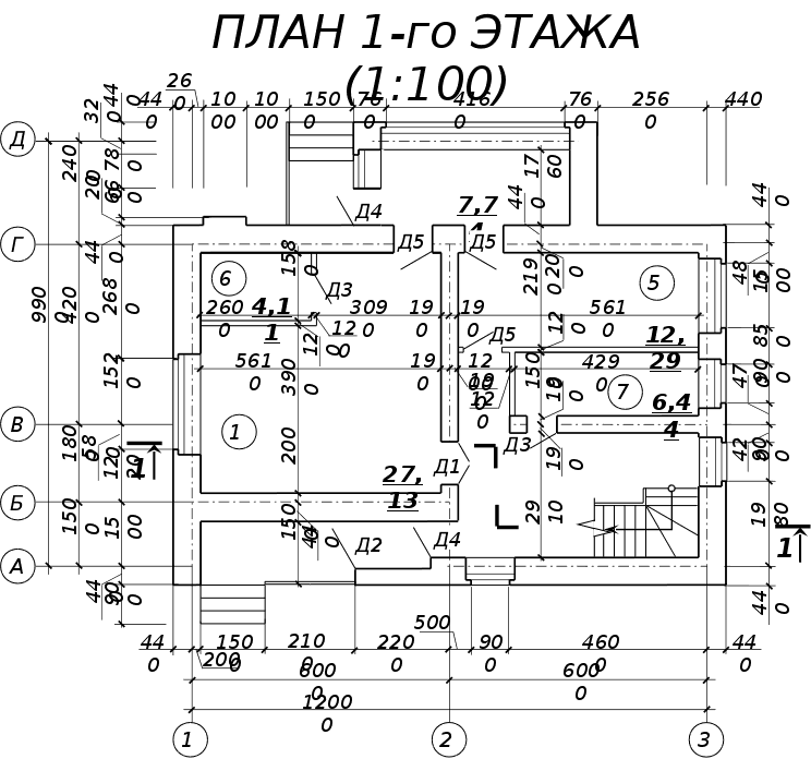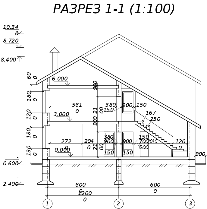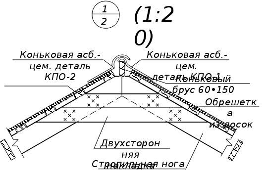 В помещениях полы примыкают к стенам. Для того, чтобы не было зазоров между полом и стенами, по всему периметру помещения прибиваются деревянные плинтусы. В помещениях, где поверхностью пола служит керамическая плитка, используется плинтус из фасонной керамической плитки. 5.6 Крыша, кровляКрыша — конструкция, обеспечивающая защиту здания от атмосферных осадков и являющаяся верхним ограждением здания. Крыша запроектирована двускатная, чердачная, стропильная. Запроектированные наслонные стропила опираются на наружные несущие стены, на которых закреплен подстропильный брус (мауэрлат). Стропильные ноги запроектированы в виде деревянного бруса, имеющего в сечении размеры 220•50. Для уменьшения величины прогиба стропил под действием веса конструкции кровли в осях В-Г предусмотрены подкосы и вертикальные стойки, которые, в свою очередь, упираются в лежень. Лежень находится на выступающей части внутренней стены на координационной оси 2. В верхней части конструкции крыши стропила соединяются друг с другом посредством двухсторонней деревянной накладки. Между осями А-В для увеличения жесткости стропил применяются затяжки из досок, а стойки и подкосы отсутствуют. Между осями Г и Д (над верандой) стропила одной стороной упираются в мауэрлат, расположенной на наружной стене с координационной осью Д, а другая их сторона вмоноличивается в стену на оси Г. К концу стропильных ног крепятся кобылки размерами в сечении 100•40 мм. Так как деревянные элементы крыши работают во влажной и огнеопасной (на чердаке проходит электропроводка) среде, они должны быть обработаны антисептиками и антипиренами. Кровля запроектирована из асбестоцементных волнистых листов. Листы укладываются по обрешетке из досок поперечным сечением 50х100 мм с шагом 370 мм. Листы стыкуются внахлестку по длине на 100 мм, а по ширине — на полволны. Крепление гвоздями осуществляется только по гребням волн, во избежание разлома кровельного материала. Отверстия под крепления предварительно просверливаются. Место стыка трубы и кровли обрамляется листами из оцинкованной стали. В верхней части кровли проходит коньковый брус сечением 50х150 мм и он закрывается двумя асбестоцементными коньковыми деталями КПО-1 и КПО-2, которые прибиваются к кровле гвоздями с антикоррозионными шляпками. Водосток — неорганизованный, так как высота здания невелика и значительного смачивания стен происходить не будет. 5.7 ЛестницыЛестницы предназначены для сообщения между помещениями, расположенными на разных этажах. Лестница расположена в холле и запроектирована деревянной одномаршевой угловой с забежными ступенями. Лестница имеет перила высотой 900 мм. Ширина ступеней (кроме забежных) равна 250 мм, высота всех ступеней равна 167 мм. Ширина марша равна 1200 мм, что является достаточным для ее эксплуатации. Конструкция лестницы имеет косоуры, к которым в паз стыкуются проступи. Между проступями, перпендикулярно им, тоже в паз стыкуются подступенки. Лестница на чердак помещение запроектирована выдвижной из потолка. 5.8 Окна и двериОкна — элементы здания, предназначенные для освещения и проветривания помещений. Двери служат для связи между изолированными помещениями и для входа в здание. Окна в здании запроектированы с двойным остеклением. Толщина оконных блоков — 140 мм, что дает право судить о достаточной