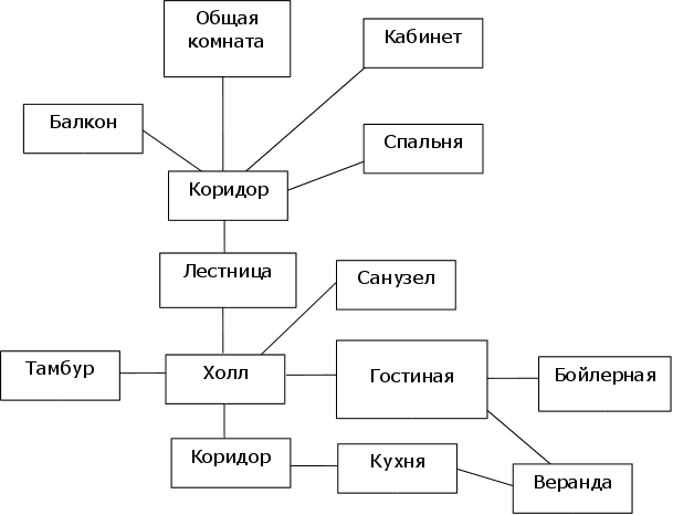 Площадь застройки – 126,71 м2. Общая площадь – 137,88 м2. Жилая площадь – 74,22 м2. Площадь, приходящаяся на одного жильца – 27,58 м2. Объем здания – 928,95 м3. Объем здания, приходящийся на одного жильца – 185,79 м3. 4 ФУНКЦИОНАЛЬНЫЕ ТРЕБОВАНИЯКоттедж предназначен для проживания в нем семьи, состоящей из 3–5 человек. К каждому помещению в здании предъявляются определенные функциональные требования, т.е. каждое помещение должно выполнять определенные функции. Гостиная предназначена для приема гостей, активного отдыха членов семьи и может также служить комнатой для приема пищи. Общая комната служит местом активного отдыха и комнатой для приема пищи. Спальня является комнатой, служащей для пассивного отдыха (сна) членов семьи. Кабинет предназначен для рабочей и творческой деятельности, не исключено также применение его для отдыха. Кухня служит для приготовления и приема пищи. Бойлерная предназначена для размещения в ней отопительного оборудования (газового котла). Санузел служит для личной гигиены членов семьи. Веранда имеет выход на открытое пространство (во двор или сад), выполняет теплоизоляционную функцию, служит для более близкого сообщения между кухней и гостиной, а также для дополнительной иллюминации первого этажа. Коридоры 1-го и 2-го этажей предназначены для сообщения между помещениями. Холл, в котором расположена лестница, служит для хранения и верхней одежды и обуви, для сообщения между этажами и другими помещениями. Балкон открывает вид на улицу и позволяет выйти на свежий воздух, не покидая здания. Тамбур служит для входа и выхода и выполняет теплоизоляционную функцию. Функциональная схема здания