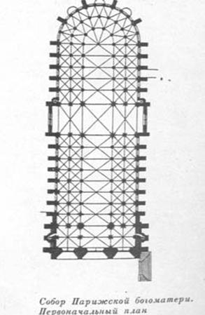 Нотр- Дам де Пари(приложение 3) Характерные черты ранней готики воплотились в главном соборе столицы Франции — Нотр-Дам де Пари (Парижской Богоматери). Величественный Нотр-Дам де Пари был заложен в 11б3 г., но его строительство продолжалось в течение нескольких столетий — до XIV в. Собор представляет собой базилику длиной сто двадцать девять метров, состоящую из пяти продольных нефов и одного поперечного — трансепта.. Это грандиозный (длина 130 ж, высота сводов 32,5 At) пятинефный храм, разделённый посередине длины коротким трансептом и завершённый хором с двойным обходом (1182), так что весь план вписывается в прямоугольник. При шестичастных сводах и одинаковых круглых столбах главной аркады, увенчанных крупными капителями, поставленная на них стена ещё массивна она получила большие верхние окна, необходимые для освещения нефа Хор собора, а также фасад с его ясными горизонтальными и вертикальными членениями, как бы с трудом врезанными в плотную стену порталами, великолепной розой и словно выросшими из тела сооружения монументальными башнями — совершенное произведение вполне установившегося стиля. В храм ведут три входа-портала, обрамлённых уходящими в глубину арками; над ними находятся ниши со статуями — так называемая «королевская галерея», изображения библейских царей и французских королей, которых отождествляли с персонажами Ветхого завета. Центр западного фасада украшает окно-роза, а над боковыми порталами вытянулись вверх окна под стрельчатыми арками. На башнях собора располагаются скульптуры фантастических чудовищ — химер. В Нотр-Дам де Пари соединились черты романского и готического стилей. Массивные башни фасада характерны для романской архитектуры, в то время как крестовый свод, опирающийся на арки, использование аркбутанов и контрфорсов, стрельчатых арок и множества окон — черты, свойственные готическому искусству. Собор Нотр-Дам в Париже ответил возросшему политическому значению города как столицы государства и завершил первый этап развития готического стиля.