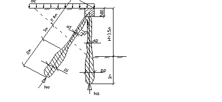 Это давление полностью воспринимается козловой системой из свай. При этом вертикальные сваи работают на сжатие, а наклонные, - анкерные, на выдергивание. Расчет устойчивости производиться на восприятие опрокидывающего момента на 1 погонный метр ограждения от бокового давления грунта в состоянии покоя и пригрузки на поверхности в 20кПа от веса механизмов(боковое давление от пригрузки – q=20кПа(1-sinj).