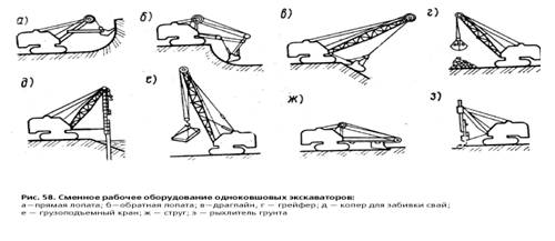 Рис. 1. Сменное рабочее оборудование одноковшовых экскаваторов: а - прямая лопата; б - обратная лопата; в - драглайн, г - грейфер; д - копер для забивки свай; е - грузоподъемный кран; ж - струг; э - рыхлитель грунта 2. Многоковшовые экскаваторы Многоковшовые экскаваторы применяются для рытья траншей, каналов, добычи глины и других, нерудных строительных материалов в карьерах. По назначению многоковшовые экскаваторы разделяются на траншейные, карьерные и ирригационные; по способу работы - на экскаваторы продольного копания и экскаваторы поперечного копания. На открытых горных работах применяются полноповоротные роторные экскаваторы большой производительности. Многоковшовые экскаваторы по конструкции рабочего органа делятся на роторные и цепные. Рабочий орган экскаваторов первой группы представляет собой вращающееся относительно своей горизонтальной оси рабочее колесо (ротор), на котором укреплены ковши. Ковши многоковшовых цепных экскаваторов закрепляются на цепях, образующих криволинейный замкнутый контур. Применение значительного количества ковшей рабочего органа экскаватора обеспечивает непрерывное копание грунта, уменьшает необходимые усилия, снижает инерционные нагрузки и способствует повышению производительности машины.