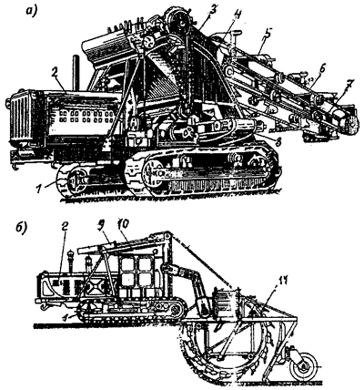Рис.2. Многоковшовые цепные (а) и роторные (б) экскаваторы 1 - ходовая часть; 2 - двигатель; 3 - цепная передача; 4 - бункер; 5 - ковши; 6 - ковшовая цепь; 7 - ковшовая рама; 8 - транспортер; 9, 10 - механизмы для подъема и привода рабочего органа; 11 - ковшовый ротор 3. Бульдозеры Бульдозер принадлежит к ряду спецтехники. Чаще всего он представляет собой колесный либо гусеничный трактор, оснащенный специальным рабочим органом. В его роли обычно выступает отвал. Отвал располагается вне колес бульдозера. Он может быть не только прямолинейным, но и криволинейным. Основной задачей бульдозеров является перемещение и планировка грунтов, а также послойное капание земли. Наиболее часто бульдозер можно встретить при выполнении такого вида задач, как добыча полезных ископаемых. Это связано с тем, что его довольно удобно использовать в карьерах и местах имеющих значительные неровности. Кроме того, использование бульдозеров довольно часто наблюдается при строительстве каналов, недвижимости, а также во время проведения строительно-ремонтных дорожных работ. В зависимости от типа отвала бульдозеры различают: с неповоротным отвалом с поворотным отвалом с универсальным отвалом В первом случае неповоротный отвал на бульдозере устанавливается перпендикулярно главной оси машины. В отличие от него, поворотный отвал можно устанавливать, как и в предыдущем варианте, так и диагонально. Причем он может иметь наклон в любую сторону от основной оси. Универсальный отвал представляет собой конструкцию, состоящую из двух частей. Они соединяются между собой на шарнирах и устанавливаются к оси под небольшим наклоном или перпендикулярно. Чаще всего бульдозеры с универсальным отвалом носят название путеукладчиков. Существует также разделение бульдозеров по типу привода. Наиболее часто встречаются модели с канатным, гидравлическим и электромеханическим приводом.