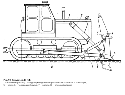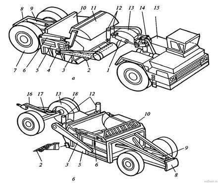 Рис. 3. Бульдозер ДЗ-54: 1 - базовый трактор; 2 - гидроцилиндры поворота отвала; 3 - отвал; 4 - козырек; 5 - ножи; 6 - толкающие брусья; 7 - раскос; 8 - опорный шарнир Базой бульдозера (рис.3) является трактор, оборудованный толкающей рамой, на которую навешен жесткий управляемый отвал, предназначенный для срезания грунта и его перемещения волоком. В транспортном положении отвал поднят над поверхностью земли, и бульдозер может передвигаться, не касаясь грунта отвалом. При движении трактора вперед для разработки грунта отвал опускают, его передняя, оснащенная ножами, кромка срезает слой грунта и перемещает его. 4. Скреперы Скрепером называется землеройно-транспортная машина, приводимая в движение тягачом или собственным двигателем и предназначенная для послойного срезания грунта, транспортирования и разгрузки его, производимой в большинстве случаев (кроме моделей с разгрузкой назад) с последующими разравниванием и предварительным уплотнением. С учетом основных признаков скреперы классифицируются: 1. По емкости ковша (м3) - на скреперы малой емкости, с ковшом емкостью до 5; скреперы средней емкости, с ковшом емкостью до 6-15; скреперы большой емкости с ковшом емкостью более 15; 2. По способу загрузки - на заполняемые за счет подпора грунта при реализации тягового усилия базового тягача и загружаемые с помощью загрузочного устройства. К первому типу относятся скреперы обычного исполнения, а к второму типу - элеваторные, гребковые, роторные. 3. По способу разгрузки - на машины со свободной, принудительной и полупринудительной (комбинированной) разгрузкой. В скреперах со свободной разгрузкой опорожнение ковша осуществляется под действием собственного веса грунта. В скреперах с принудительной разгрузкой полное опорожнение ковша осуществляется с помощью задней стенки. В скреперах с полупринудительной (комбинированной) разгрузкой часть объема грунта высыпается под действием собственного веса, а часть с помощью принудительной очистки. 4. По типу привода - на машины с канатным, электромеханическим и гидравлическим приводом. Канатный привод состоит из следующих узлов: механической лебедки, системы полиспастов и направляющих блоков, а также рычагов управления. Электрический привод состоит из электродвигателя, шестеренчатого редуктора и зубчатого реечного механизма. К электромеханическому приводу следует отнести также привод, состоящий из электролебедки и канатно-блочного механизма. Гидравлический привод включает насос, бак с жидкостью, гибкие шланги и гидрораспределитель. 5. По способу агрегатирования - на прицепные, полуприцепные, самоходные и скреперные поезда. Прицепной скрепер буксируется гусеничным или двухосным колесным трактором. Полуприцепной скрепер находится в сцепке с гусеничным или двухосным колесным трактором (тягачом) передней частью (хоботом) через опорно-сцепное устройство. Самоходный скрепер представляет собой единую конструкцию с индивидуальной энергетической установкой, обеспечивающей передвижение машины и работу всех агрегатов, в том числе и управление рабочими органами. 6. По типу тягача или самоходного оборудования - на колесные и гусеничные. Самоходные скреперы, как правило, выполнены на пневмоколесном ходу. 7. По типу трансмиссий - на механические, гидромеханические, электрические и гидростатические.