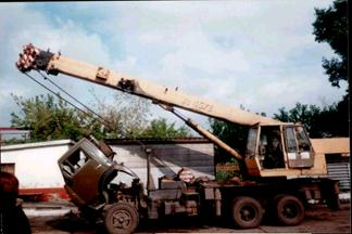Бульдозер с неповоротным отвалом и гидроуправлением, выпускаемый на базе гусеничного трактора, состоит из отвала, оснащенными режущими грунт ножами, толкающих брусьев и раскосов. Отвал выполнен коробчатой сварной конструкции с накладками жесткости, приваренными на тыльной стороне. Толкающие коробчатые брусья шарнирами соединены с проушинами тыльной стороны отвала и задними концами присоединены к упряжным шарнирам гусеничных балок трактора. Раскосы соединяют верхние углы отвала с проушинами толкающих брусьев. Посредством двух гидроцилиндров отвал поднимают в транспортное и опускают в рабочее положение. В положении отвала ножами на уровне опорной поверхности задний угол отвала и ножей должен составлять около 200. Техническая характеристика гусеничных бульдозеров с неповоротным отвалом: · Номинальная тяга: от 3 до 35тс. · Размеры отвала: длина от 2560 до 4540мм. высота (без козырька) от 800 до 1400мм. · Высота подъема: от 600 до 1400мм. · Глубина резания: от 200 до 1000мм. · Угол резания: 550±5град. · Угол перекоса: ±4 - ±6град. · Способ измерения угла перекоса: вручную или гидроцилиндром · Управление отвалом: гидравлическое, канатное · Масса бульдозерного оборудования: 780-3980кг. · Масса общая с трактором: 6560-31380кг. Бульдозеры могут иметь и один подъемный гидроцилиндр, который размещается перед радиатором двигателя трактора. Такие бульдозеры выпускают на базе гусеничных и колесных тракторов. Существуют бульдозеры на гусеничных тракторах с канатным управлением. На базе гусеничных тракторов серийно выпускают бульдозеры с поворотным отвалом и поперечным его перекосом. Имеются бульдозеры, у которых верхние раскосы толкателей выполняются с винтовыми стержнями, служащими для бесступенчатого регулирования угла резания. Техническая характеристика гусеничных бульдозеров с поворотным отвалом: · Номинальная тяга: от 3 до 35тс. · Размеры отвала: длина от 3500 до 5540мм. высота (без козырька) от 800 до 1400мм. · Высота подъема: от 600 до 1100мм. · Глубина резания: от 200 до 1000мм. · Угол резания: 550±5, 47-57, 50-60град. · Угол перекоса: ±5 - ±6град. · Способ измерения угла перекоса: вручную или гидроцилиндром · Управление отвалом: гидравлическое, канатное · Масса бульдозерного оборудования: 1585-3450кг. · Масса общая с трактором: 9100-40100кг. Стреловые самоходные краны Под стреловыми самоходными кранами общего назначения понимают краны с собственным приводом для свободного перемещения по местности, предназначенные для выполнения строительно-монтажных и перегрузочных работ при помощи одного из видов сменного рабочего оборудования. Стреловые самоходные краны классифицируются по грузоподъемности, конструкции ходового устройства, типу привода, исполнению стрелового оборудования и виду стрелового оборудования. В зависимости от грузоподъемности стреловые самоходные краны разделяются на легкие – грузоподъемностью до 10 тонн, средние – грузоподъемностью от 10 до 25 тонн и тяжелые – грузоподъемностью 25тонн и более. По конструкции ходового устройства различают краны гусеничные, пневмоколесные, автомобильные, на специальном шасси. По типу привода основных механизмов различают краны с одномоторным и многомоторным приводом. По конструктивному исполнению подвески стрелового оборудования различают краны с гибким и жесткими связями для удерживания стрелового оборудования и изменения уг