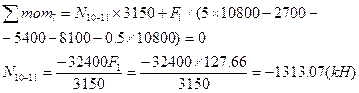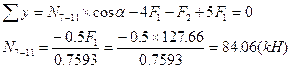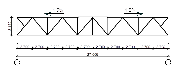 Значения усилий определяем методом сечений. За расчетную нагрузку фермы принимается расстояние между осями поясов. Уклоном верхнего пояса фермы при i = 0,015 можно пренебречь. cosa