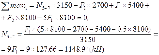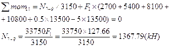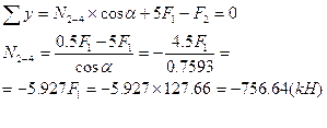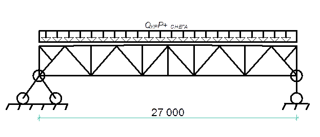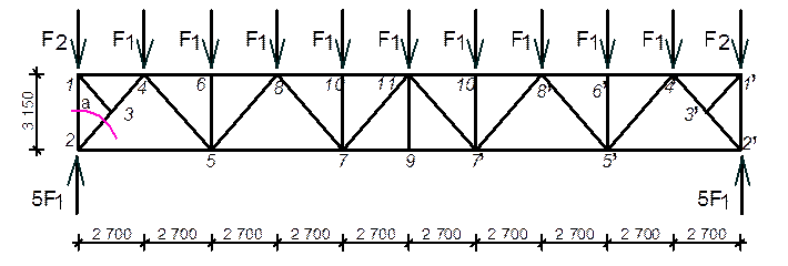 Значения погонных равномерно распределенных расчетных нагрузок от собственного веса конструкций и снега (в кН/м) определяются по формулам: QКР = qКР × В = 3,81× 8 = 30,48 кН/м ; РСНЕГА = РСН × В = 2,1× 8 =16,8 кН/м ; где В – шаг ферм (В = 8 м); qКР, РСН – расчетные нагрузки действующие на ферму из табл. 1 Общая нагрузка на промежуточные узлы фермы от собственного веса конструкций и снега определяется по формуле: F1 = (QКР +PСНЕГА) × d = (30,48 + 16,8) × 2,7 = 127,66 кН; где d – длина панели верхнего пояса (d = 2,7 м) Общая нагрузка на опорные стойки от собственного веса конструкций и снега определяется по формуле : F2 = 0,5 × F1 = 0,5 × 127,66 = 63,83 кН