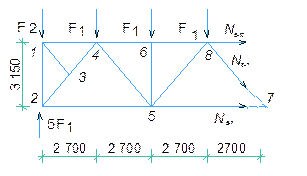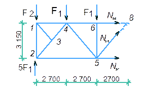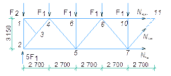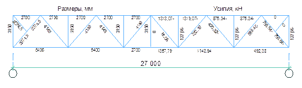 Рис. 6. Размеры элементов фермы и усилия в них Таблица 2 Расчетные усилия в элементах фермы