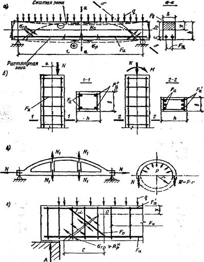 Введение1.1 Железобетон — комплексный материал Железобетон представляет собой комплексный строительный материал, состоящий из бетона и стальных стержней, работающих в конструкции совместно в результате сил сцепления. Известно, что бетон хорошо сопротивляется сжатию и значительно слабее растяжению (в 10—20 раз меньше, чем при сжатии), а стальные стержни имеют высокую прочность как при растяжении, так и при сжатии. Основная идея железобетона и состоит в том, чтобы рационально использовать лучшие свойства составляющих материалов при их совместной работе. Поэтому стальные стержни (арматуру) располагают так, чтобы возникающие в железобетонном элементе растягивающие усилия воспринимались в большей степени арматурой. В изгибаемых элементах, например в плитах, балках, настилах и др., основную арматуру размещают в нижней, растянутой зоне сечения (рис. 1.1, а), а в верхней, сжатой зоне ее либо совсем не ставят, либо ставят небольшое количество, необходимое для конструктивной связи стержней в единые каркасы и сетки. В элементах, работающих на сжатие, например в колоннах (рис. 1.1, б), включение в бетон небольшого количества арматуры также значительно (в 1,5—1,8 раза) повышает их несущую способность. Возникающие в колоннах растягивающие напряжения от поперечных деформаций воспринимаются хомутами или поперечными стержнями; последние служат также для связи продольных стержней в плоские или пространственные каркасы. В растянутых элементах (рис. 1.1, в) действующие усилия воспринимаются арматурой.