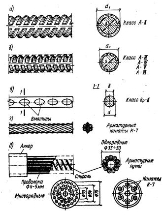 Рис. 1.1. Схемы работы железобетонных элементов под нагрузкой 2.2 Арматура Назначение, виды и классы арматуры. Арматуру в железобетонных конструкциях применяют в качестве рабочей, определяемой по расчету, и монтажной, назначаемой без расчета по конструктивным соображениям. Рабочая арматура воспринимает растягивающие усилия в изгибаемых и растянутых элементах и усиливает сечения сжатых элементов. Монтажная арматура служит для установки в проектное положение и связи рабочей арматуры, для образования плоских и пространственных каркасов и сеток. Кроме того, она воспринимает усилия от усадочных и температурных деформаций бетона, от части монтажных нагрузок. В некоторых случаях монтажную арматуру можно учитывать в расчетах, что позволит снизить расход рабочей арматуры. Стальная арматура в зависимости от технологии изготовления разделяется на горячекатаную стержневую и холоднокатаную проволочную. Арматура, подвергающаяся после прокатки (в целях упрочнения) термической обработке, называется термически упрочненной, а подвергающаяся вытяжке в холодном состоянии — упрочненной вытяжкой. Арматура, которая при изготовлении конструкций предварительно натягивается до заданного напряжения (на упоры или на бетон), называется напрягаемой арматурой. Арматура выпускается с гладкой поверхностью и с ребрами периодического профиля (рис. 1.5). Стержневая арматура периодического профиля, имеющая лучшее сцепление с бетоном, является основным видом рабочей арматуры. Арматурная сталь подразделяется на классы в зависимости от профиля и основных ее механических свойств
