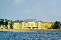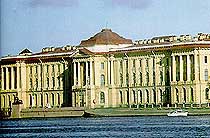 Е В плане здание представляет собой прямоугольник, в который вписан кольцеобразный корпус (“циркуль”), ограничивающий круглый двор. Главный фасад организован четким ритмом вертикальных членений - колонн и пилястр дорического ордера, поднимающихся на высоту двух верхних этажей. Вход выделен выступающим вперед портиком, между колоннами которого стоят статуи Геркулеса и Флоры - копии произведений античных ваятелей. Академия “трех знатнейших художеств” - живописи, скульптуры и архитектуры - была создана в 1757 году по инициативе выдающихся деятелей русской культуры М.В.Ломоносова и И.И.Шувалова. Неотъемлемой частью архитектурного комплекса Академии художеств является гранитная пристань на берегу Невы. Она сооружена по проекту К.А.Тона в 1832-1834 гг. По сторонам лестничного спуска на массивных гранитных пьедесталах установлены величественные изваяния сфинксов, найденные при раскопках в Фивах, столице Древнего Египта. Дворцовая площадь