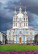К числу известнейших интерьеров Зимнего дворца относилась также Большая церковь, расположенная в юго-восточном улгу здания. Кроме парадных залов на втором этаже находились жилые помещения членов императорской фамилии. Первый этаж занимали хозяйственные и служебные помещения. На верхнем этаже в основном были расположены квартиры придворных. В 1762 году, вскоре после восшествия на престол Екатерины II, Растрелии пришлось поать в оставку, так как творческая манера зодчего не отвечала вкусам новой императрицы. Отделка интерьеров была поручена архитекторам Ю.М.Фельтену, Ж.Б. Валлен-Деламоту и А.Ринальди. Они внесли ряд изменений в первоначальную планировку и оформление дворца. В работах по формлению дворцовых интерьеров участвовали и другие видные архитекторы. В 1826 году по проекту К.И.Росси перед Георгиевским залом построили Военную галерею, на стенах которой разместилось 330 портретов генералов - участников Отечественной войны 1812 года.В начале 1830-х годов в восточном корпусе дворца ряд парадных залов перестроил О.Монферран. Им были оформлены Фельдмаршальский, Петровский и Гербовый залы. Разрушительный пожар 17-19 декабря 1837 года почти полностью уничтожил прекраснейшую отделку Зимнего дворца, от которого остался лишь обгорелый остов. Восстановительные работы продолжались два года. Ими руководили архитекторы В.П.Стасов и А.П.Брюллов. Согласно повелению Николая I большую часть дворца надлежало "восстановить в прежнем виде". Однако беды Зимнего дворца на этом не кончились. в 1918 году многие его помещения были предоставлены вновь созданному Музею революции, что повлекло за собой переустройство их интерьеров. Кроме того, в залах дворца неоднократно проводились съезды и конференции различных общественных организаций. С 1922 года помещения Зимнего дворца начали постепенно передаваться Эрмитажу. Государственный Эрмитаж - крупнейший художественный музей страны. Смольный собор Создание архитектурного ансамбля Смольного началось с возведения Воскресенского Новодевичьего монастыря (рядом со Смоляным двором). По своему расположению монастырь стал называться Смольным. Работы велись по проекту Ф.-Б. Растрелли с 1748 г. В двухэтажных зданиях, окружающих крестообразный в плане монастырский двор, находились жилые покои. На внутренних углах двора поставлены башни-церкви, как бы вторящие стройному силуэту собора, сооруженного в центре. Нижняя часть собора, расчлененная на два яруса, переходит в высокий барабан центрального купола, к которому тесно прижаты стройные башни четырех колоколен. Ощущение необыкновенной устремленности ввысь рождается при взгляде на это здание. Смольный собор скульптурен в своей пластичности. Многообразии ракурсов, динамике объемов. Неисчерпаемая фантазия декорировки, звучное сочетание лазури стен и белизны лепки, топкая позолота маковок придают ансамблю редкую живописность. Строительство монастыря продолжалось до 1769 г., но полностью замысел Растрелли не был осуществлен. Осталась недостроенной 140-метровая колокольня перед собором. Внутренняя отделка собора была проведена лишь в 1832 -- 1835 гг. арх. В П. Стасовым, по рисунку которого отлита и ажурная ограда у входа. Петропавловская крепость