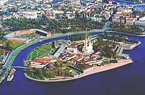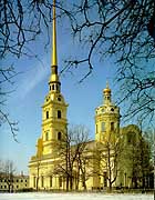 юга в Фортецию Санкт-Петербурх заложили 16 мая 1703 года. Бастионная система ее укреплений напоминала планы “идеальных городов”, восходивших к образцам архитектуры Ренессанса. При строительстве учитывались и все новейшие достижения европейской фортификации. Первая деревоземляная крепость была сооружена “с крайним поспешанием” к весне 1704 г. Она получила в плане форму неправильного шестиугольника с вынесенными вперед бастионами. Наблюдение за их строительством вел Петр I и его сподвижники - А.Д.Меньшиков, Г.И.Головкин, Н.М.Зотов, Ю.Ю.Тубецкой и К.А.Нарышкин. Подступы к крепости с наиболее уязвимой северной стороны в 1705-1708 гг. были прикрыты укреплениями Кронверка, расположенного на правом берегу Кронверкского пролива. В 1706-1740 гг. деревоземляные сооружения на Заячьем острове были постепенно заменены каменными, которые превосходили по размерам первоначальную крепость. Работами руководил архитектор Д.Трезини, а с 1734 г. - военный инженер Б.-К.Миних. Бастионы о соединяющие их куртины имеют высоту до 12м и ширину до 20 м. Они состоят из двух стен - наружной толщиной до 8м и внутренней толщиной 2 м. Пространство между стенами бастионов заполнялось песком, щебнем, землей или отводилось для устройства казематов с амбразурами, предназначавшимися для установки орудий. Казематы в куртинах служили для хранения оружия, боеприпасов и размещения солдат гарнизона. В 1730-х гг. были возведены дополнительные укрепления - равелины: Алексеевский с западной стороны и Иоановский с восточной. Между равелинами проходили широкие рвы, заполненные водой (засыпанные в конце XIX в.). По концам рвов стояли заградительные устройства - ботардо, которые должны были преграждать путь вражескому десанту. Они частично сохранились до наших дней. Южные стены и бастионы в 1779-1785 гг. были облицованы крупными блоками серого гранита. К главному входу в крепость перекинут деревянный Иоановский мост через Кронверкский пролив.. К Петропавловскому собору ведет центральная аллея. Вблизи Петровский ворот ее фланкируют протяженные одноэтажные здания. Справа - бывший Артиллерийский цейхгауз (1801-1802 гг.). Слева - бывший Инженерный дом (1748-1749 гг.) с высокой крышей и белыми деталями на розовом фоне стен. Посередине крепости еще в 1703 г. была построена деревянная церковь. Существующий собор возводился по проекту Д.Трезини с 1712 г. по 1733 г. В первую очередь воздвигли многоярусную колокольню с высоким шпилем. Венчает его флюгер в виде фигуры летящего ангела с крестом. В 1756 г. здание загорелось от удара молнии. При восстановлении были уменьшены размеры купола, упрощена форма крыши. Спустя столетие, в 1857-1858 гг., по проекту инженера Д.И.Журавского сделан металлический шпиль, достигший высоты 122,5 м. Собор и поныне остается самым высоким архитектурным сооружением Санкт-Петербурга. Здание служило и царской усыпальницей. Здесь похоронены почти все русские императоры, начиная с Петра I, могила которого находится у южного входа в собор. Уникальные надгробия Александра II и его жены Марии Александровны исполнены из яшмы и орлеца камнерезами Петергофской гранильной фабрики (1800-1906 гг. архитектор А.Л.Гун). Напротив усыпальницы, в глубине небольшой площадки, стоит двухэтажная постройка с четырехколонным портиком - бывшая Обер-офицерская гауптвахта. Каменное здание было построено в 1748-1749 и перестроено в 1907-1908 гг. 