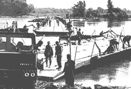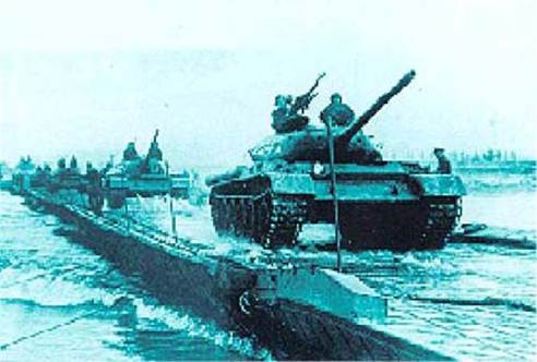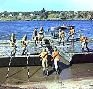 Примеров этому множество, особенно в области создания средств инженерного вооружения. Взять, к примеру, главное переправочное средство всех армии мира – понтонные парки. Нам, конечно, очень помогли традиции. Начиная с эпохи Петра I, русские и советские понтонные парки всегда были лучшими в мире. И пока таковыми являются. Западу ничего не оставалось, как перенять у нас принципиальные решения складных мостов-лент и паромов-лент парка ПМП (обр. 1960 г.) – первой модификации системы понтонных плавсредств. В принципе мосты-ленты изобрели еще в древние времена. Ведь берега нешироких рек выгоднее связать бревенчатыми плотами, нежели, затрачивая много усилий, периодически гонять плоты по воде. К примеру, Иван Грозный для обеспечения обходного маневра при взятии Риги распорядился навести бревенчатый мост-ленту через Даугаву История создания парка ПМП