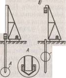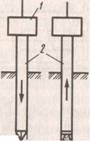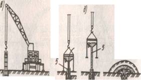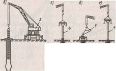 Рис. 1.12. Технологическая схема устройства буронабивных свай с применением обсадных труб а -монтаж ротора и забуривание скважины с одновременным погружением обсадной трубы; б -проходка скважины; в -зачистка забоя скважины; г -установка арматурного каркаса; д - заполнение скважины бетонной смесью, извлечение обсадной трубы; е - формование головы сваи в инвентарном кондукторе 4.2 Пневмотрамбованные сваи Сваи применяют при устройстве фундаментов с большим притоком воды, затрудняющим сооружение буронабивных свай. В этом случае бетонную смесь укладывают в полость обсадной трубы при постоянном повышенном давлении воздуха (0,25...0,3 МПа), который подается от компрессора через ресивер. Бетонную смесь подают небольшими порциями через специальное устройство - шлюзовую камеру, действующую по принципу пневмонагнетательных установок, при меняемых для транспортирования бетонной смеси. Шлюзовые камеры состоят из двух отрезков труб, соединенных фланцами, которые имеют верхние и нижние отверстия, закрываемые клапанами. Подачу смеси через воронку в верхнюю камеру осуществляют при закрытом нижнем клапане; после подачи порции верхний клапан верхней камеры закрывается, а нижний -открывается и т. д. 4.3 Вибротрамбоваиные сваи Сваи используют в сухих связных грунтах, в которых можно укладывать бетонную смесь в открытую скважину глубиной 4...6 м. Такие сваи устраивают следующим образом. В грунт с помощью вибропогружателя, подвешенного к экскаватору, погружают стальную обсадную трубу, имеющую на конце съемный железобетонный башмак. После погружения трубы вибропогружатель снимают и внутреннюю полость трубы заполняют на 0,8...1 м бетонной смесью. С помощью трамбующей штанги, подвешенной к вибропогружателю, смесь трамбуют, в результате чего она вместе с башмаком вдавливается в грунт, образуя при этом уширенную пяту. Заполнив бетонной смесью обсадную трубу, ее извлекают из грунта с помощью экскаватора, при работающем вибропогружателе. 4.4 Частотрамбованные сваи Сваи устраивают пyтем забивки обсадных труб, опирающихся на металлический (обычно чугунный) наконечник. Затем в полости, образованной обсадной трубой, устраивают армированную (или неармированную) сваю, уплотняя бетонную смесь с помощью ударов паровоздушного молота двойного действия, передающихся через трубу. Частотрамбованные сваи, (рис. 1.15) устpаивают с помощью сцециально оборудованного копра в такой последовательности. На копер лебедкой поднимают паровоздушный молот двойного действия и обсадную трубу, которая в верхней части имеет оголовок. На нижний конец обсадной трубы насаживают металлически башмак со смоляным канатом, чтобы исключить проникновение в трубу воды. Под действием удара молота обсадную трубу погружают до проектной отметки. Погружаясь, труба раздвигает частицы грунта и уплотняет его. Затем молот поднимают, а в полость трубы опускают арматурный каркас (если сваи армируются). Из вибробадьи через воронку подают в полость обсадной трубы бетонную смесь с осадкой конуса 8...10 см. Параллельно с yкладкой смеси извлекают (вытягивают) обсадную трубу из грунта, причем металлический башмак остается в основании сваи. В это время молот двойного действия, вновь соединенный с обсадной трубой, уплотняет бетонную смесь при этом сила его погружающего удара в два раза меньше выдергивающих у