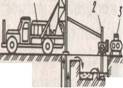 Рис.1.10. Технологическая схема устройства буронабивных свай сухим способом а - бурение скважины; б -устройство уширенной полости; в -установка арматурного каркаса; г - установка бетонолитной трубы с вибробункером; д - заполнение вибробункера бетонной смесью; е -бетонирование скважины методом ВПТ; ж -утепление оголовка сваи в зимних условиях; l-шнековая бурильная установка; 2 '-расширитель; 3 -кран грузоподъемностью10...12 т; 4 -бетонолитная труба; 5 -загрузочный бункер Применяемые в строиельстве бетонолитные трубы, как правило, состоят из отдельных" секций и имеют стыки, позволяющие быстро и надежно соединять: трубы. В приемную воронку бетонную смесь подают непосредственно из автосмесителя или с помощью специального загрузочного бункера. По мере укладки бетонной смеси бетонолитную трубу извлекают из скважины. В скважине бетонную смесь уплотняют с помощью вибраторов, укрепленных на приемной воронке бетонолитной трубы. По окончании бетонирования скважины голову сваи формуют в специальном инвентарном кондукторе и в зимнее врeмя защищают утеплителем. По этой технологии чаще всего изготовляют буронабивные сваи диаметром 400, 500, 600, 1000 и 1200 мм и длиной до 30 м. Глинистый раствор для удержания стенок скважин от обрушения применяют при устройстве буронабивных свай (рис. 2.11) в неустойчивых обводненных грунтах. В этом случае скважины бурят вращательным способом. Однако при проходке по скальным включениями прослойкам используют сменные рабочие органы ударного типа (грейферы, долота). В скважину глинистый раствор поступает по пустотелой буровой штанге. За счет гидростатического давления, оказываемого этим раствором, плотность которого 1,2...1,3 г/см3, устраивают сваи без обсадных труб. Глинистый раствор готовят на месте производства работ преимущественно из бентонитовых глин, и по мере бурения его нагнетают в скважину. Поднимаясь по скважине вдоль ее стенок, глиняный раствор попадает в зумпф, откуда возвращается насосом в буровую штангу для дальнейшей циркуляции. Затем в скважину устанавливают арматурный каркас. Бетонную смесь подают с помощью вибробункера с бетонолитной трубой, которую опускают в скважину