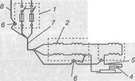 1 - пункт живлення; 2 - зварювальний трансформатор; 3 - регулятор; 4 - електродотримач; 5 — шланговий одножильний дріт; 6 - заземлюваль-ний болт; 7 - живильний шланговий трижильний кабель із заземлювальною жилою; 8 - нульовий дріт мережі. Рис. 6.1. Схема підключення зварювального трансформатора Зварювальні кабелі