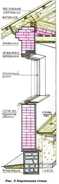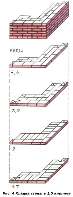 На (рис.4) показаны порядовки кладки толщиной в 1,5 кирпича простенков, углов, а также устройство четвертей проемов при многорядной системе перевязки. По краям оконных и дверных проемов для установки коробок закладывают с каждой стороны по две деревянные пробки размером в полкирпича. Их нужно обернуть одним слоем рубероида. Коробки перед установкой в проем также изолируют рубероидом. Разрез готовой кирпичной стены показан на (рис.5). Однако стены сплошной кладки из полнотелого кирпича толщиной более 38 см (то есть в 1,5 кирпича) экономически невыгодны. Во-первых, из-за того, что получается слишком большой расход строительных материалов, а во-вторых, тяжелые стены требуют соответственно и массивных фундаментов, что еще более увеличивает расход кирпича, цемента и т. д. Что в таком случае надо делать? Есть два варианта. Первый — использовать эффективный (пустотный) кирпич. Второй — строить из обыкновенного полнотелого кирпича, применяя облегченную кладку. Какие же конструкции ее можно предложить? 1. Стены, в толще которых сделаны воздушные промежутки шириной 4—6 см. 2. Стены, облицованные изнутри плитным утеплителем. 3. Стены с теплоизоляционной засыпкой между наружным и внутренним рядами кирпича и поперечными стенками (так называемая колодцевая кладка). 4. Стены с засыпкой и горизонтальными диафрагмами.