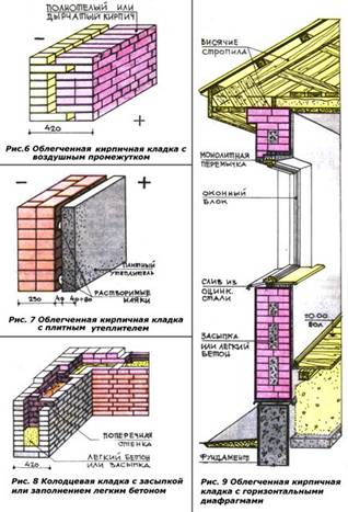 Такая стена рассчитана на температуру наружного воздуха от —20° до —30° (при использовании эффективного кирпича допустимые температуры будут —30—40°). Через каждые 4— 6 рядов обе кладки перевязывают тычковым рядом кирпичей по всей длине стены. Кирпичные связи можно заменить на армирование стальными прутками диаметром 6—8 мм с шагом 50 см.Для лучшего сцепления с раствором концы прутков нужно согнуть. И еще. Они не должны доходить до наружных граней стены на 4—6 см. Стены с плитным утеплителем делают так.(рис.7).К обычной сплошной кладке с помощью растворных маяков (при этом образуется воздушный зазор в 2—4 см) крепят теплоизоляционные плиты. Возможен и другой способ деревянные рейки прибивают к пробкам, установленным в швах кладки, затем на них набивают утеплитель (арболит, фибролит, жесткие минерало-ватные плиты или плиты из легкого бетона, а также других материалов неорганического происхождения). Для районов, где зимняя температура —30°, стену кладут в полтора кирпича и утепляют фибролитовыми плитами толщиной 50 мм, а при использовании эффективного кирпича толщина кладки может быть 25 см (то есть в один кирпич). Стены колодцевой кладки с засыпкой или заполнением легким бетоном имеют следующую конструкцию (рис.8).Поперечные стенки устраивают через три кирпича по длине. Наружные углы выложены тычковым рядом. Засыпку мелким шлаком, керамзитом или другими легкими заполнителями делают по мере возведения стены слоями по 10—15 см (тщательно трамбуя каждый слой). Через 2—3 слоя засыпку поливают известковым раствором сметанообразной консистенции. Вместо перечисленных заполнителей можно использовать песок, смешанный с опилками и известью-пушонкой в пропорции примерно 1:4:1. Завершать колодцевую кладку нужно 3—4 рядами сплошной кладки, предварительно армировав металлической сеткой последний ряд с засыпкой.