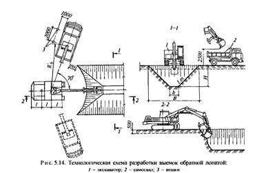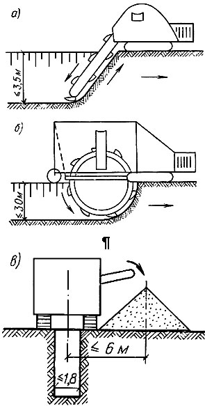 Экскаватор «обратная лопата» применяют при разработке фунтов ниже уровня стоянки экскаватора, в основном при отрывке котлованов глубиной до 6 м и траншей при глубине до 7,6 м. Затраты времени на один цикл экскаватора с обратной лопатой на 10... 15% больше, чем у прямой лопаты. Поярусная разработка выемок при этом виде оборудования не практикуется.