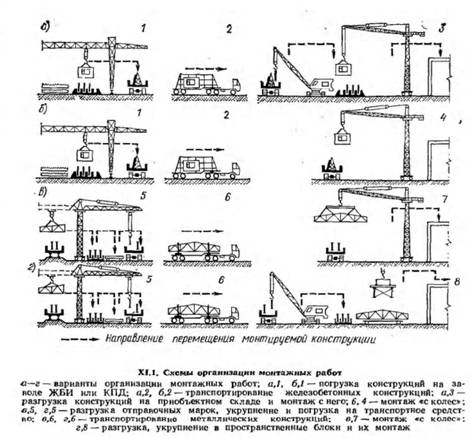 Технологическая структура монтажных процессовВажным фактором для строителей является технологичность возводимого здания в целом, включая технологичность используемых монтажных элементов, которые подразумевают: - минимальное количество типоразмеров монтируемых элементов, т. е. степень типизации конструкций; - максимальная строительная готовность поставляемых конструкций - степень точности геометрических размеров и положения закладных деталей; - удобство строповки, подъема, установки и выверки всех элементов; - простота и удобство заделки всех стыков и заливки швов; - близкий к 1 показатель монтажной массы, выражающий отношение среднего веса конструкций к максимальному, т. е. их укрупненность и равновесность. Комплексный технологический процесс монтажа сборных строительных конструкций - совокупность процессов и операций, в результате выполнения которых получают каркас, часть здания или сооружения, полностью возведенное сооружение. Вся совокупность процессов, позволяющая получить готовую смонтированную продукцию, состоит из транспортных, подготовительных, основных и вспомогательных процессов. Транспортные процессы состоят из транспортирования конструкций на центральные и приобъектные склады, погрузки и разгрузки конструкций, сортировки и укладки их на складах, подачи конструкций с укрупнительной сборки или складов на монтаж, транспортирование материалов, полуфабрикатов, деталей и приспособлений в зону монтажа. При складировании конструкций особо контролируют их качество, размеры, маркировку и комплектность. При монтаже зданий с транспортных средств исключаются процессы разгрузки и сортировки, так как конструкции сразу подаются на монтаж. Подготовительные процессы включают: проверку состояния конструкций, укрупнительную сборку, временное (монтажное) усиление конструкций, подготовку к монтажу и обустройство, подачу конструкций в виде монтажной единицы непосредственно к месту установки. Дополнительно входят процессы по оснастке конструкций приспособлениями для временного их закрепления и безопасного выполнения Работ, нанесение установочных рисок на монтируемые элементы, намека подмостей и лестниц, если это требуется выполнить до подъема конструкций. Вспомогательные процессы включают подготовку опорных поверхностей фундаментов, выверку конструкций, если ее выполняют после их установки, устройство подмостей, переходных площадок, лестниц и ограждений, выполняемых в период установки конструкций. Основные или монтажные процессы - установка конструкций в проектное положение, т. е. собственно монтаж. В состав монтажных процессов входят: - подготовка мест установки сборных конструкций; - строповка и подъем с необходимым перемещением в пространстве, ориентировании и установке с временным закреплением; - расстроповка; - окончательная выверка и закрепление; - снятие временных креплений; - заделка стыков и швов. В зависимости от вида конструкций, монтажной оснастки, стыков и условий обеспечения устойчивости, выверку можно осуществлять в процессе установки, когда конструкция удерживается монтажным краном, или после установки при временном ее закреплении. Приведенная структура процесса монтажа строительных конструкций является обобщающей и в каждом конкретном случае может быть уточнена в сторону ув